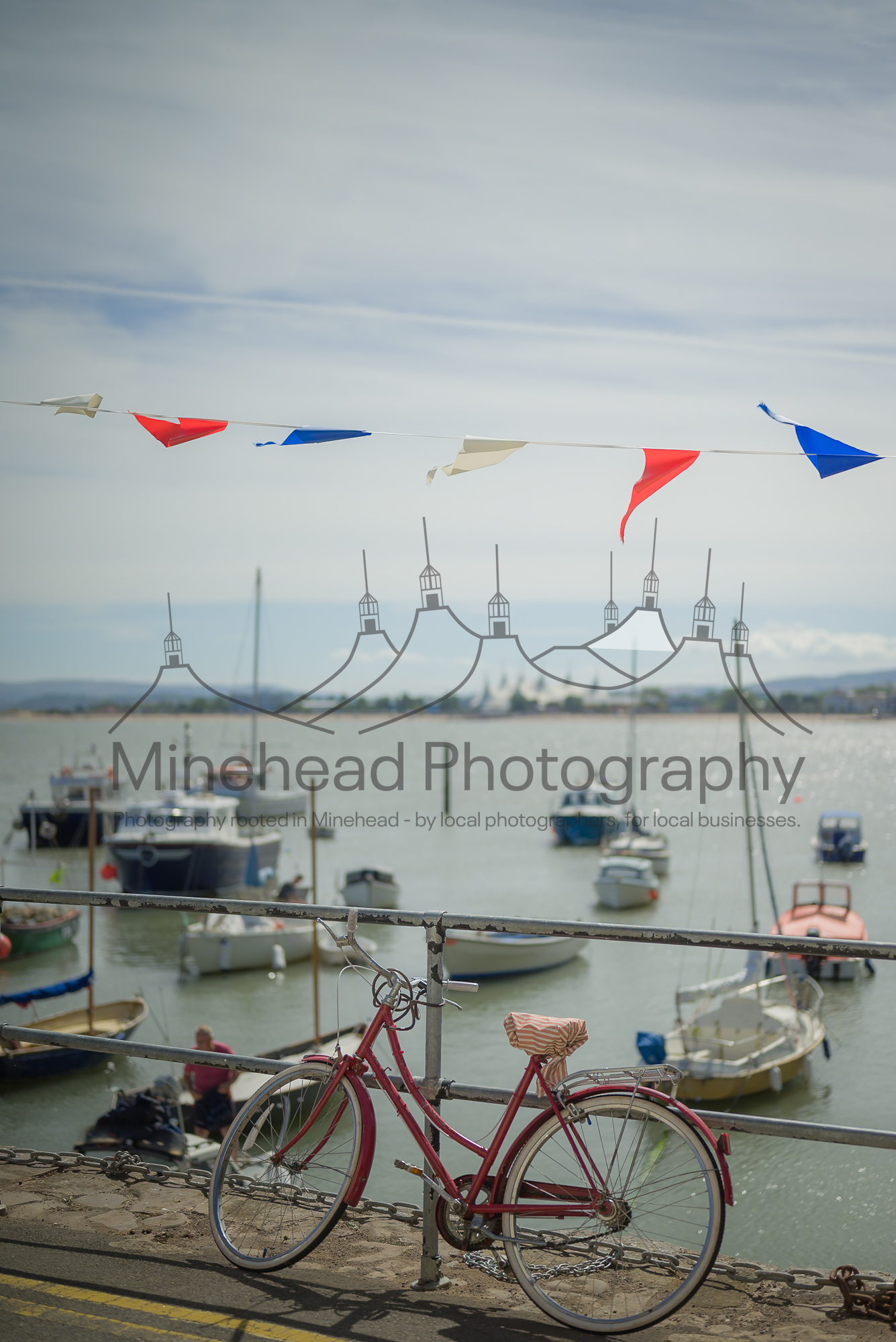 A charming coastal scene captured at Minehead Harbour on a pleasant spring or summer’s day. In the foreground, a vintage-style red bicycle leans against a weathered metal railing, its presence evoking nostalgia and quiet contemplation. Above it, festive red, white, and blue bunting dances in the sea breeze. The calm harbour water glistens under soft light, reflecting moored sailboats and small vessels. In the distance, soft hills and the silhouette of a large tented structure rise against a serene, cloud-brushed sky. The overall mood is peaceful, leisurely, and timeless.